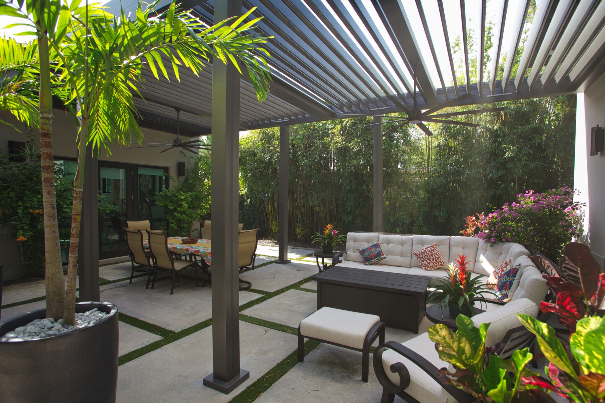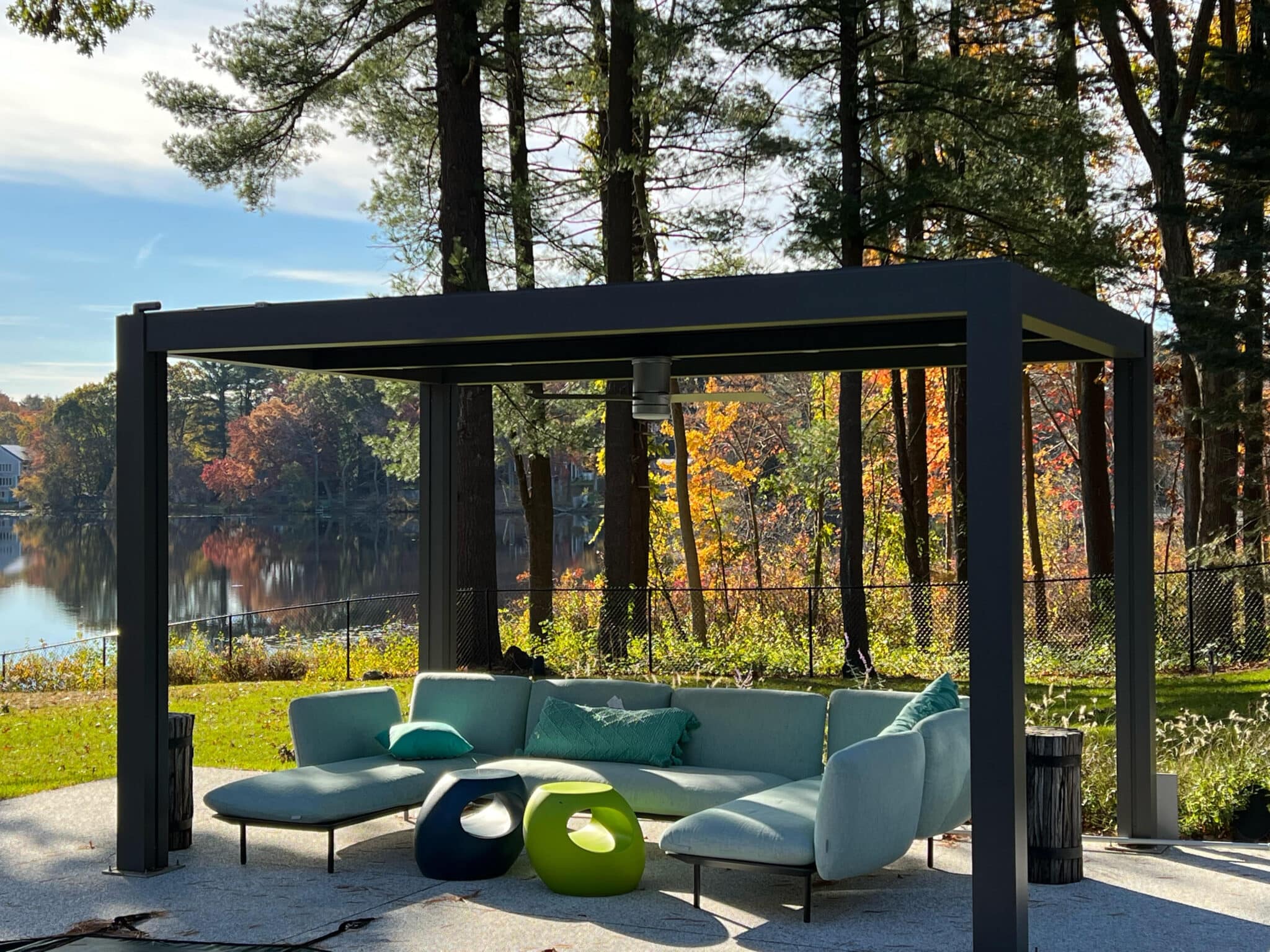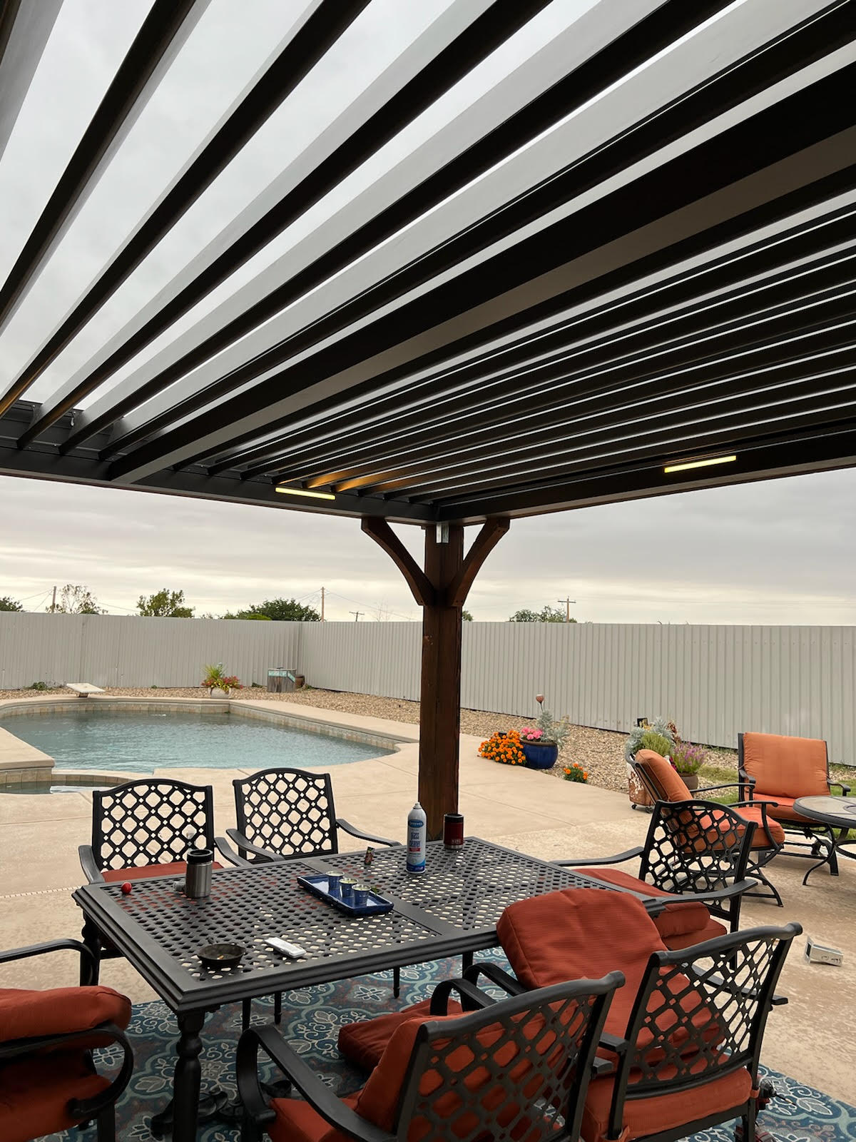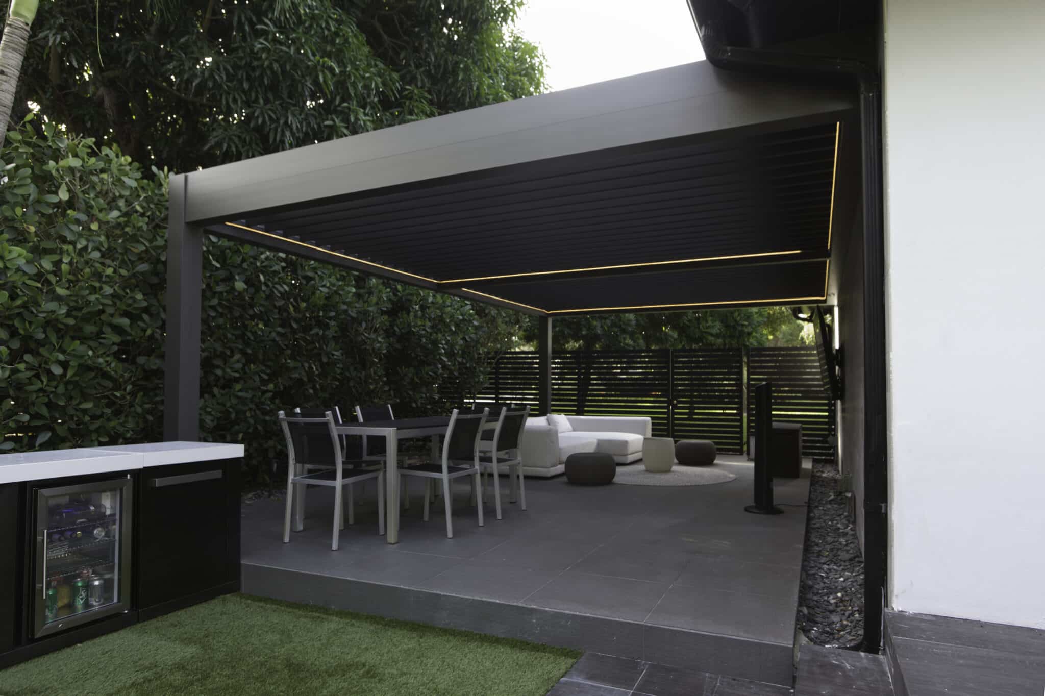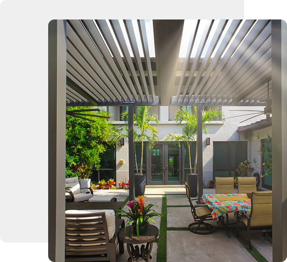Imagine creating the perfect atmosphere for your friends and family to enjoy your outdoor living space. Seamlessly integrate a motorized pergola into your backyard. The roof opens and closes based on your needs. If you want to still be outside while it’s raining you simply close the louvers and you now have a weather tight roof. Need some sunshine? Open up your louvers to create the warmth you need